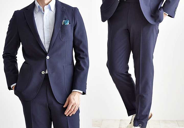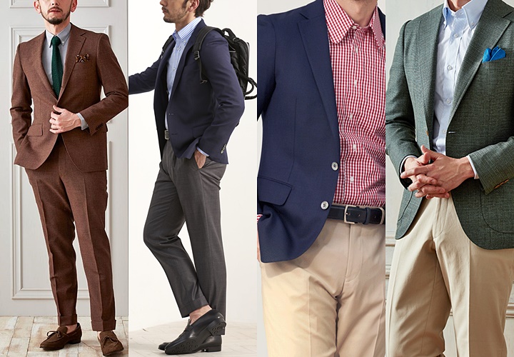 手軽に着回せるセットアップは、ネイビー・グレーの無地がオススメ。中に着るアイテムを変えることで、ドレスライクにもカジュアルライクにできます。個性的でラフな印象を求める仕上げ方には、ベージュやイエローなど明るい色もぜひ候補に。 さらに季節に合わせて、リネンウール、シアサッカーなど素材感のあるスタイルを選んで、周りと差をつけられます。チェックやストライプなどの柄物をアクセントとして取り入れるのも効果的。