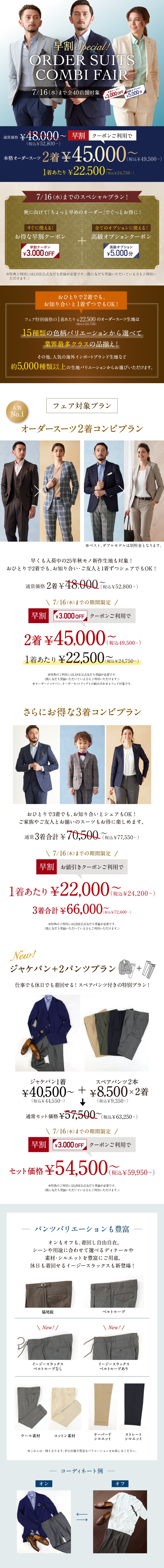 現在、1着2万円台~オーダーできるお得なフェアも開催中。皆さんも是非、この機会にオーダーしてみてください。