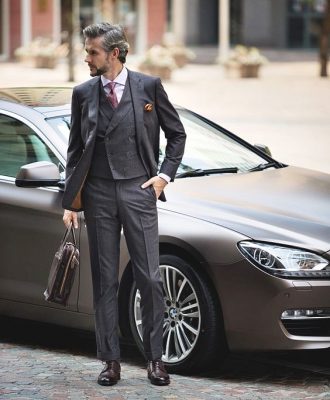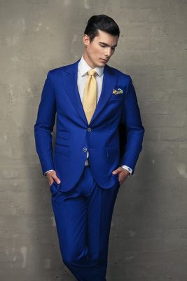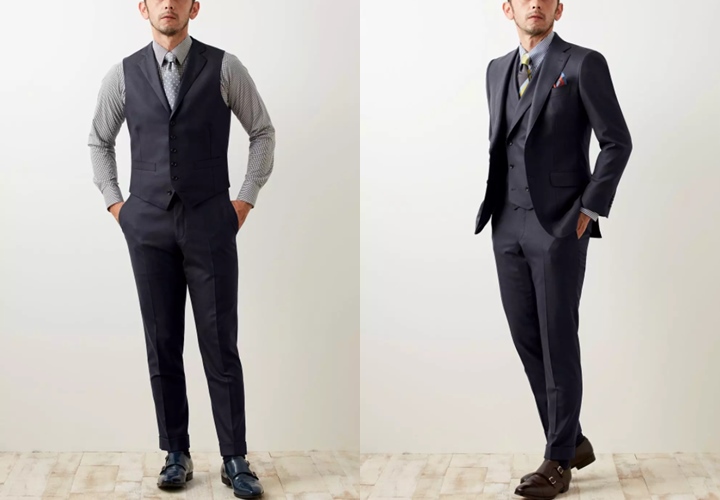 オススメ生地でも紹介したブルースーツ。発色の良さが際立ちエレガントな装いになります。明るい色の小物との相性が良いのでスタイルの幅も広がります。スリーピースで仕立てたいコーディネートです。
