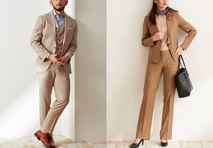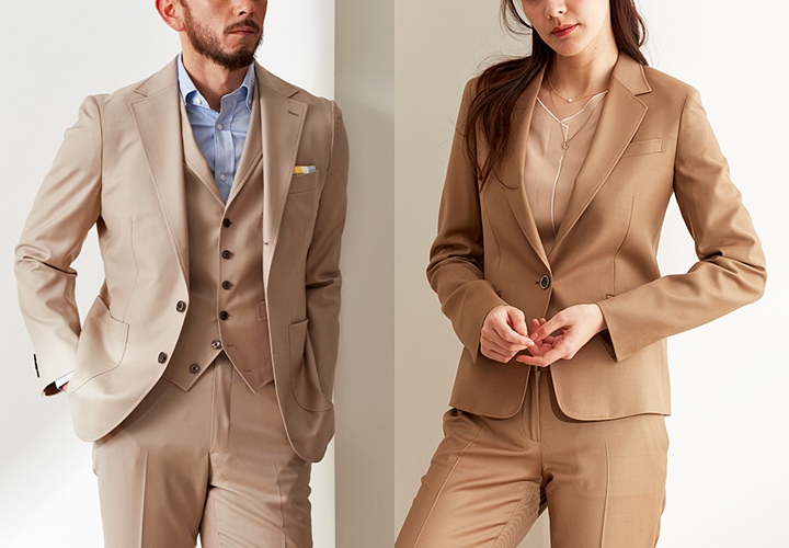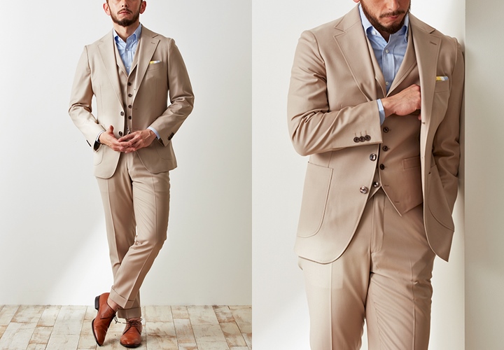 滑らかで光沢感がある明るめのベージュの生地で仕立てたスーツ。爽やかなブルーのシャツとペールトーンのチーフでカラーバランスを整えています。ノーネクタイスタイルでも映えるコーディネートです。