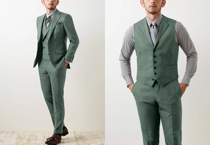 今までのグリーンのバリエーションにはない、パステル調・ミルキーな色合いが魅力。着用シーンは、華やかなシーンにオススメ。他の人と確実に差をつけれるオーダースーツならではのコーディネートです。