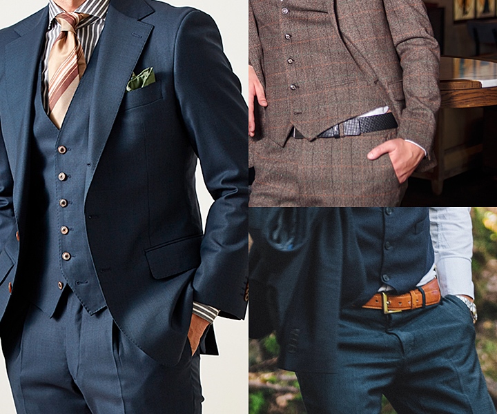 スリーピースのベストを着用した時にベルトのバックルが覗いてしまうと、腰位置が低く感じてだらしなく見えてしまうので注意して下さい。体型変化に伴いベストのサイズが小さくなっている場合は、新調することをオススメします。
