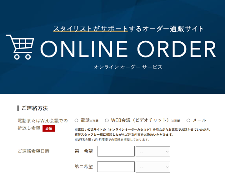 店舗でのスタイリストや店長経験のあるベテランスタッフがサポートしてくれます。メール、電話、対面でのWEB会議などの中から、あなたの御希望に沿ったコンタクトの仕方で専門スタイリストのサポートが受けられるので安心です。便利さだけではない、オンラインオーダーでもあなただけのカスタマイズされた一着を作ることが可能です。