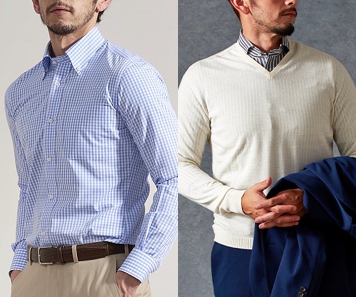 ビジカジで着用するシャツは、スーツの際に着用しているシャツでも問題ありません。色は、白や青系のシャツを選ぶとバランスがよく、爽やかな印象になります。ノーネクタイの場合には、ボタンダウンシャツがおすすめです。柄は、ストライプやギンガムチェックのシャツでまとめると、カジュアルさが増し、華やかさを演出できます。Tシャツスタイルの場合は、白無地が定番です。また、季節に合わせて、夏はポロシャツ、冬はニットやカーディガンを取り入れても良いでしょう。
