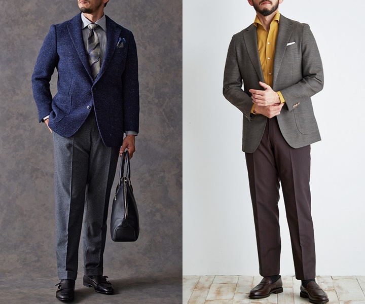 ジャケパンスタイルの際には、季節感のずれに注意しながらジャケット・パンツを選ぶことが重要です。例えば、春夏用のジャケットに秋冬用のスラックスを合わせると、不自然な見た目になってしまいます。選ぶ際には素材や生地を確認しましょう。ジャケットは、定番のネイビーやグレーを選ぶとパンツと合わせやすくなります。パンツはジャケットの色味に合わせたスラックスを選びましょう。ジャケットが暗めなら明るめのパンツ、ジャケットが明るめなら暗めのパンツを合わせるとコーデにメリハリがつき、ワンランク上のお洒落さを演出できます。