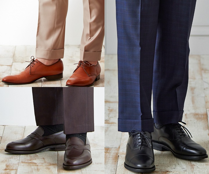 靴を選ぶ際には、シーンによって合わせる靴が異なります。フォーマルに見せたい場合は、プレーントゥやストレートチップの革靴がおすすめです。ドレッシーなコーデになります。全体をカジュアルに見せたい場合には、ローファーやスリッポン、レザースニーカーなどを合わせることでおしゃれを楽しむことができます。また、靴の色はブラックやブラウンなどのベーシックなものを選ぶと良いでしょう。