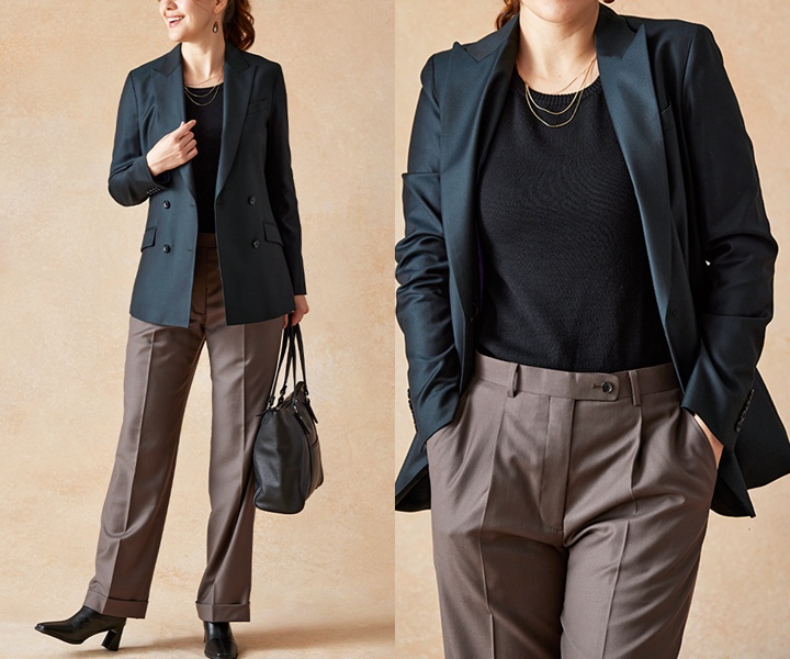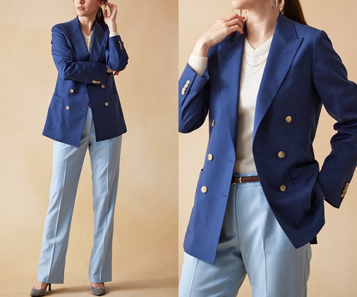 20代女性のカジュアルフォーマルには、爽やかさときちんと感を両立したコーディネートがおすすめです。深みのあるブルーのダブルジャケットが洗練された印象を与えます。さらに、ライトブルーのパンツを合わせることで、上品かつ清潔感のある雰囲気に仕上がります。