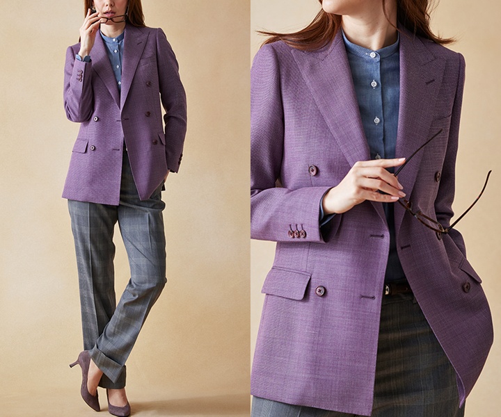 春夏の女性のカジュアルフォーマルには、程よいカジュアル感と季節らしい軽やかさを演出するコーディネートがおすすめです。パープル×バーズアイのダブルジャケットがさりげない表情を加えつつ、グレー×チェックのパンツを合わせることで上品な印象にまとまります。