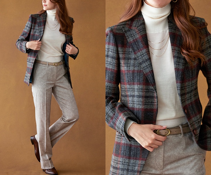 秋冬の女性のカジュアルフォーマルは、落ち着きの中に程よい華やかさを取り入れ、季節感を演出すると良いでしょう。グレーをベースに赤のラインの入ったチェック柄ジャケットに、ベージュパンツを合わせることで、女性らしさと品の良さを兼ね備えた秋冬コーデが完成します。