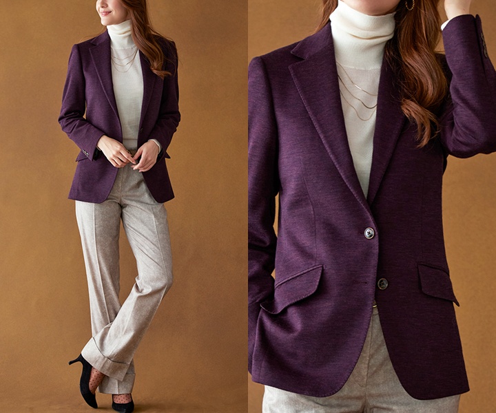 深みのあるパープルジャケットを主役にしたコーデもおすすめです。上品な色味のジャケットにベージュパンツを合わせることで、華やかさと落ち着きをバランスよく表現しています。さらに、インナーのタートルネックニットが季節感と柔らかさをプラス。大人らしい上品な秋冬向けカジュアルフォーマルです。