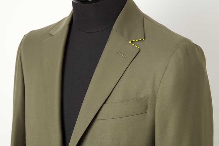 ゴージラインとは、スーツのジャケットの上襟(カラー)と下襟(ラペル)との縫い合わせの部分のこと。このゴージラインの角度によって合うシャツの襟型が決まってきます。