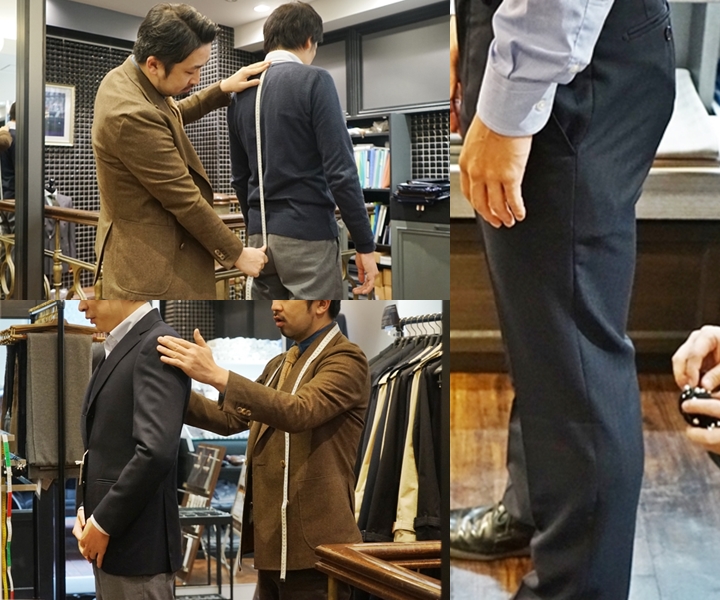 ヒアリング→ヌード寸の計測→スーツモデルの選定→ゲージ服(サイズ見本服)の試着→体型に合わせて調整