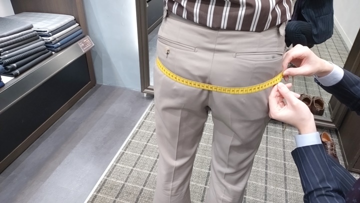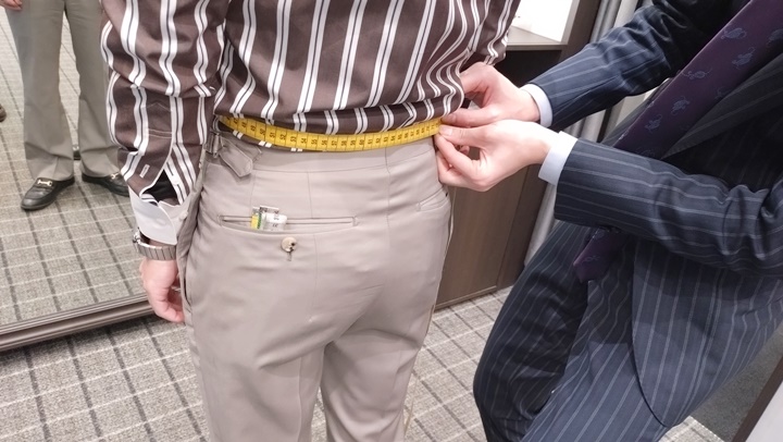 パンツの穿き位置でのウエストを計測します。文字通りパンツの〆寸法の目安を決めます。