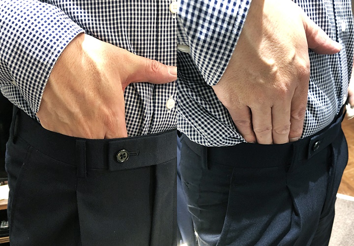 横ジワがないか、食い込みがないか、逆に余りがないかを確認します。このとき、実際に椅子に座ったりしゃがんだりして普段の動きをしてゆとりに問題がないかを確認します。