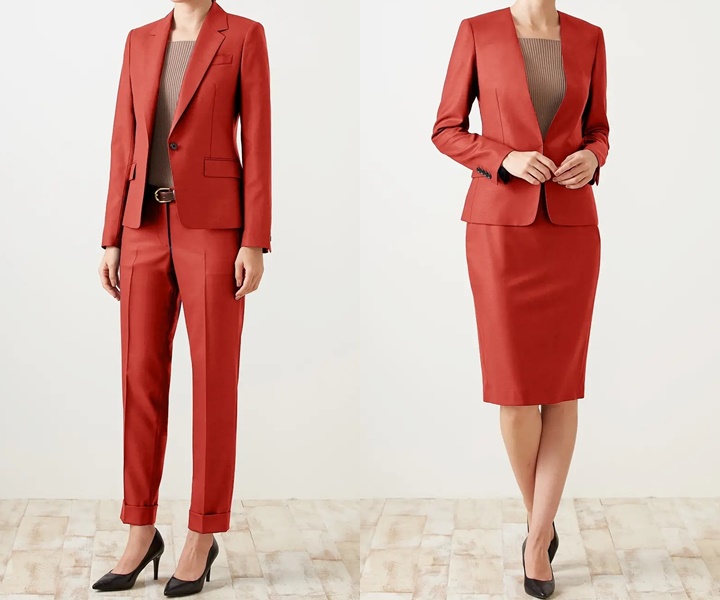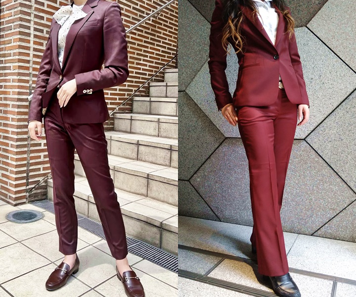 深みのあるワインレッドのような赤色でエレガントな印象を与えるシングルスーツ。左のモデルはボウタイのブラウスと、ジャケットの2つボタンが女性らしさを引き立つ印象に。右のモデルはジャケットの1つボタンがシャープな印象に。