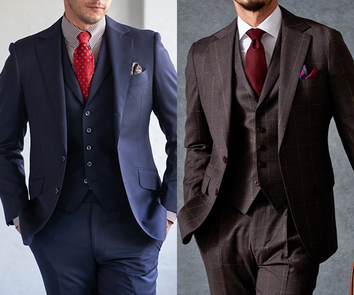 レッドをベースにしたダークブラウン色のスリーピーススーツ。オールシーズン着用でき、スリーピース(ベスト付き)でフォーマル感や重厚感も出るため、ビジネスシーンでも着用することができる。