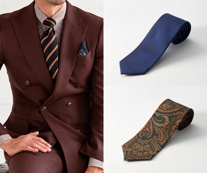赤スーツは、魅力的で印象的なスタイルを出しやすいスーツ。赤スーツに柄物ネクタイを合わせることで、遊び心のある個性的な印象となります。ブルー系のネクタイは落ち着いた印象を与え、赤スーツとのコントラストが美しいです。ビジネスカジュアルからフォーマルまで幅広く対応できます。また、同系色でまとめる際には、色のトーンを少し抑えたネクタイを選ぶといいでしょう。洗練された一体感を出すことができます。