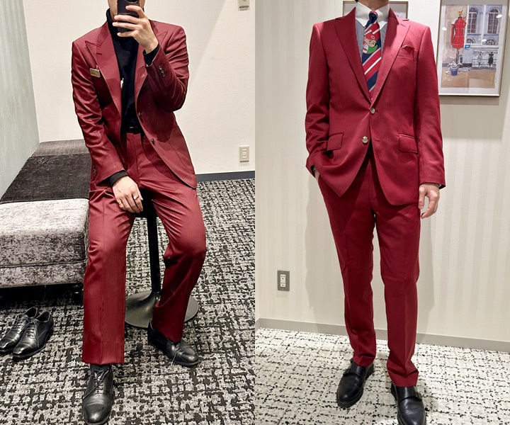定番のネイビー・グレー・ブラックスーツに比べるとまだまだ少数派である「赤スーツ」。