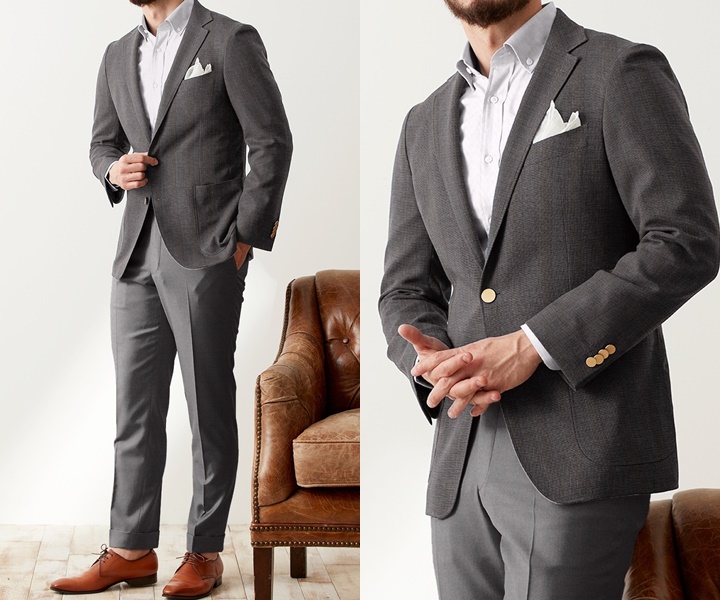 上品なチャコールグレーとシンプルな無地は、落ち着いた色味とシンプルなデザインにより、汎用性の高い一着。シアサッカースーツに挑戦したいけど、ストライプ柄には抵抗がある方には最適。シンプルな無地ながら、凹凸のあるデザインが特徴で、お洒落な着こなしに。