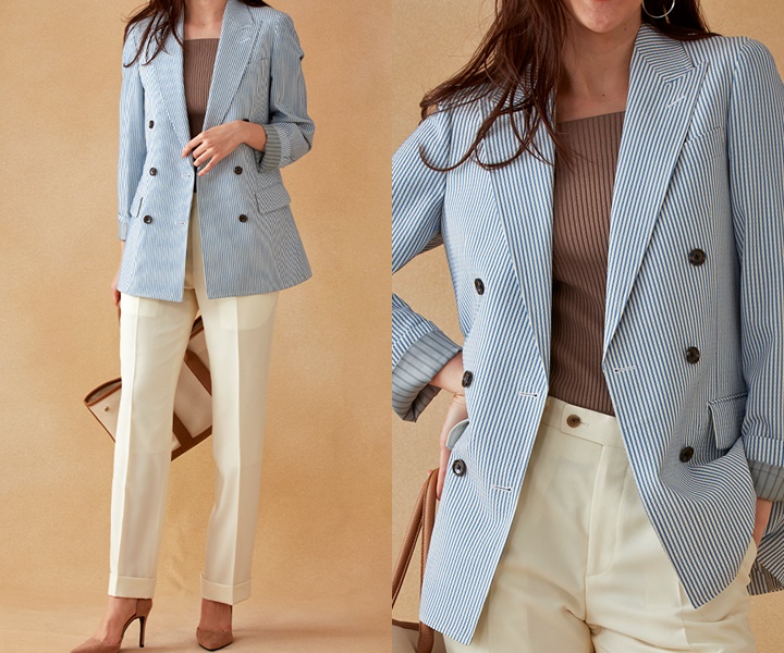 爽やかなブルーに定番のストライプ柄で清潔感があり、ビジネスシーンやイベントにも適している。カジュアルな雰囲気のジャケットと相性が良いアウトポケットオプション(外側にポケットを貼り付ける仕様)で軽やかな印象に。
