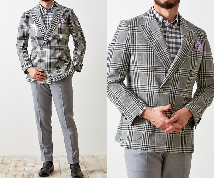 ミディアムグレーをベースにチェック柄の生地で、オールシーズン着用できる。重厚なダブルのジャケットにあえてカジュアルな印象のアウトポケットをチョイスし、軽やかな着こなしに。チェック柄はインパクトがあるので、ジャケットとしての着用もおすすめ。