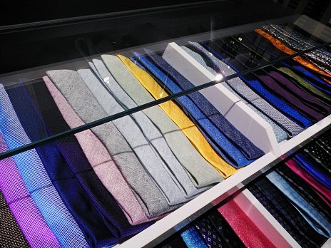 柄が小さいとコーディネートがしやすく、写真のように柄が大きいものは使われている色を少なくすると良いでしょう。小紋柄のネクタイの配色は、基本的にスーツと合せるのがポイントです。