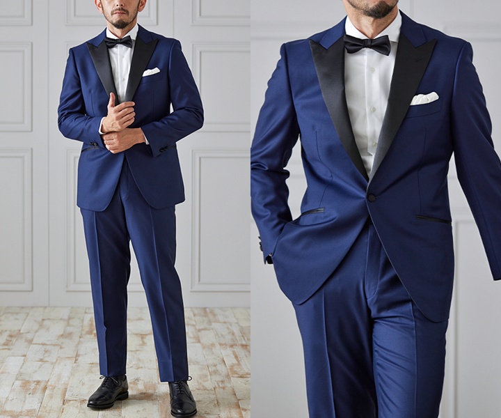 結婚式にはタキシードスタイルのネイビースーツもおすすめです。美しい艶感のネイビースーツがラグジュアリーな印象を与えてくれます。またホワイト無地のシャツに、ブラックの蝶ネクタイがアクセントとなり、特別な日を華やかに彩ります。