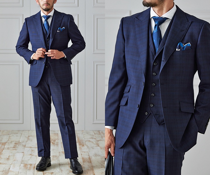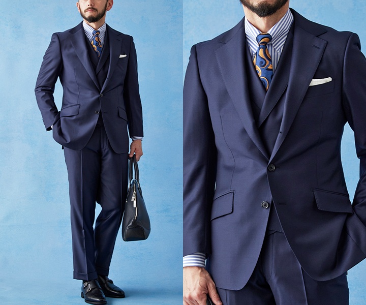 ネイビーには、高級感・真面目・堅実・信頼・知的といったイメージがあり、ビジネスシーンやフォーマルなシーンにも対応できるため、最初に選ぶスーツとしても人気です。また、濃色(ダークネイビー)・淡色(ライトネイビー)など、落ち着いた大人な印象から爽やかで若々しい印象まで、着こなしの用途に合わせて選べる汎用性の高さがあります。