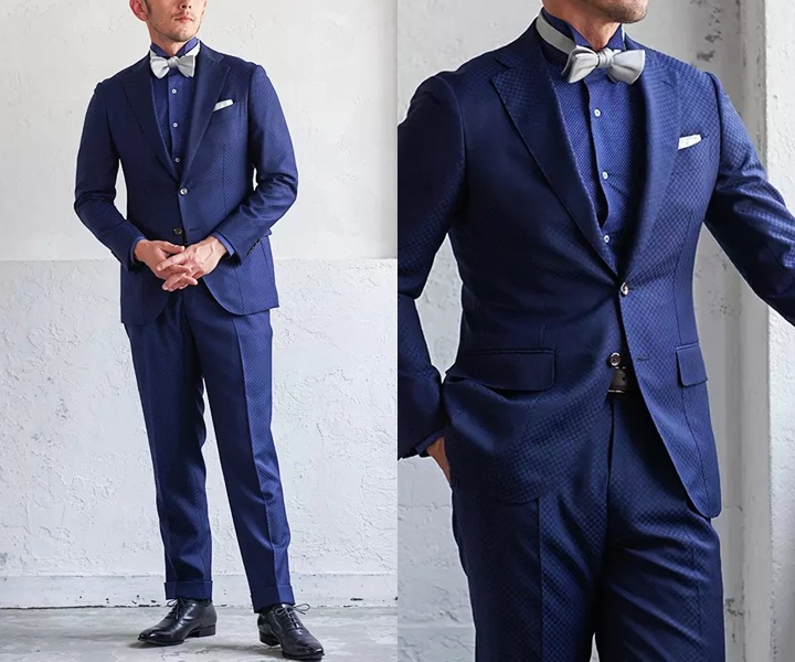 ネイビースーツは、結婚式などのフォーマルシーンにもおすすめです。結婚式では会場の雰囲気に合わせた着こなしをすることが大切で、カジュアルな雰囲気の場合は、派手過ぎない程度の明るい色で華やかさを演出しましょう。同系色のシャツに蝶ネクタイがアクセントとなり、個性の光るコーディネートに仕上がります。