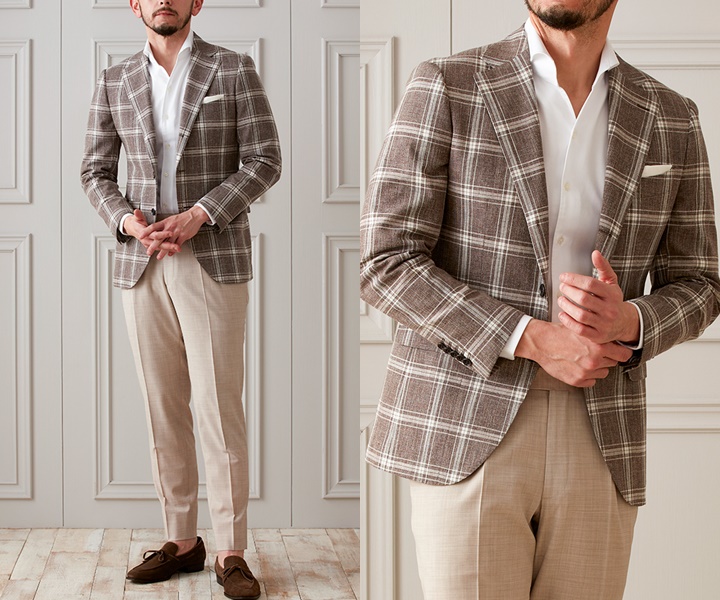 ブラウンのチェック柄のジャケットには、白シャツとベージュのパンツといったベーシックなカラーを合わせることで、バランスの良いジャケパンコーデになります。柄を取り入れたい方にはおすすめな着こなし方です。