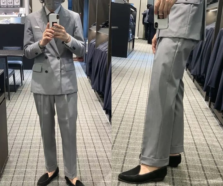 やや短めの裾丈でくるぶしが隠れるくらいにすると、足元がすっきりと見え、細身スーツスタイルによく合います。このスタイルはスタイリッシュな印象を与えますが、カジュアルさが強まります。一方、裾丈を長めにしてかかとが隠れる程度にすると、クラシックで重厚感のある印象が強まります。シーンや着こなしの目的に合わせて長さを選びましょう。オーダースーツ専門店なら裾丈だけでなく、パンツのサイズ感も好みに調整することができます。