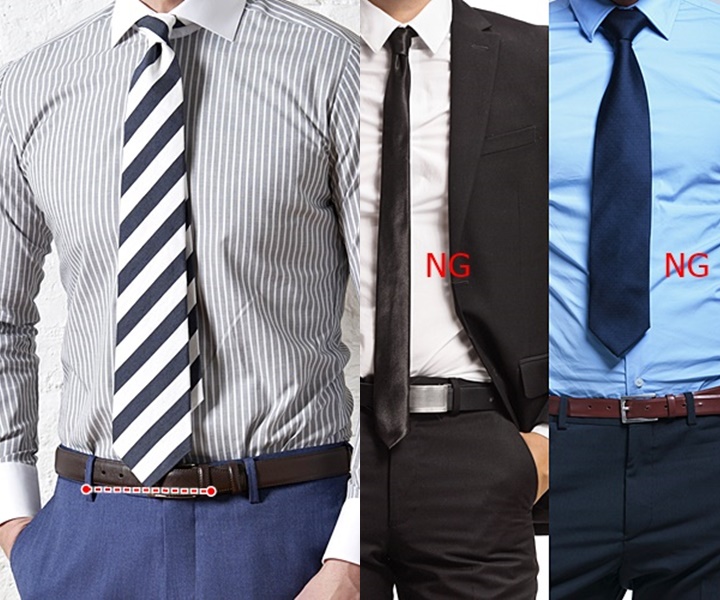 大剣の長さの目安は、ネクタイの結び目を調整した際に大剣の先端がベルトのバックルに半分かかる程度となります。長すぎるとだらしなく見え、短すぎるとアンバランスで幼い印象を与えてしまいます。最適な長さにするためには、ネクタイを締めた後に、軽く引っ張って長さを微調整することも重要です。全体のバランスを見ながら長さ調整をすると良いでしょう。