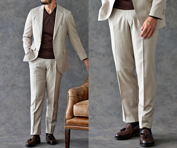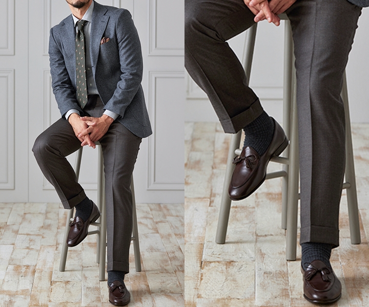 1.【ジャケパンスーツ×ブラウンタッセルローファー】