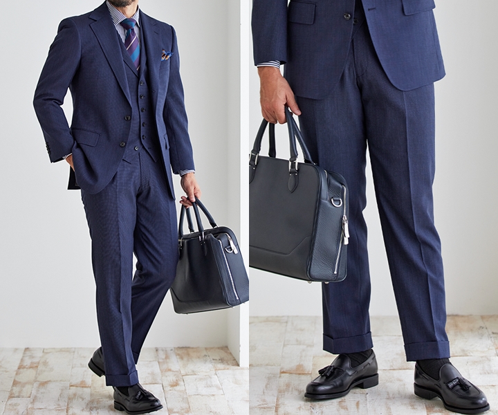 落ち着いたネイビーのスーツを基調とし、ブラックのタッセルローファーとレザーバッグを組み合わせた、洗練されたビジネススタイルです。