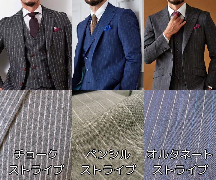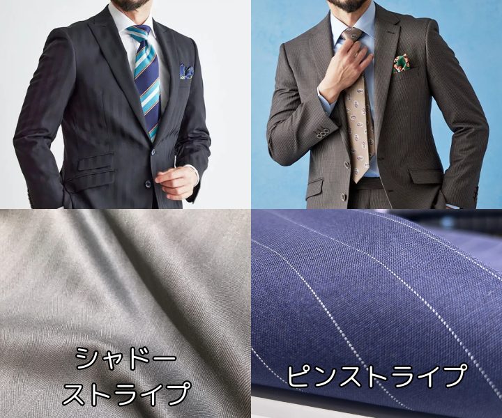 ・ピンストライプ・・・ピンで打ったような、非常に細い点線状の縞模様が特徴です。ベースカラーと同系色のストライプを選べば、華美になりすぎず、ビジネスシーンでも使いやすい印象にまとまります。
