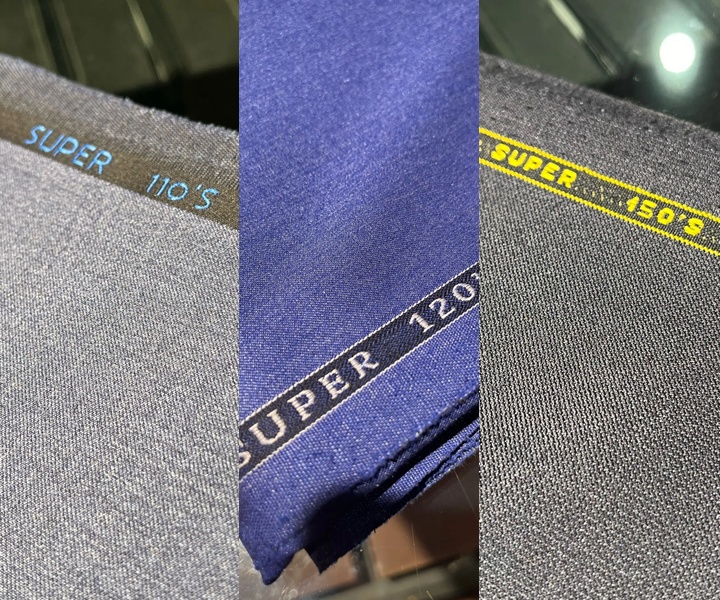 スーツ生地の価格差は、こうした風合いの違いに加え、使用されている繊維の細さが大きく影響しています。繊維が細くなるほど肌触りや光沢は向上しますが、その分生産コストも高くなり、高級生地として扱われます。この繊維の細さは「SUPER表示」としてスーツ生地のタグに記載されており、数値が高いほど、より細い繊維を使用した上質な生地であることを示しています。