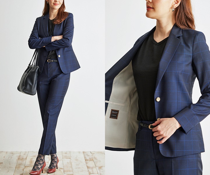 シンプルながらこなれ感を感じさせるウィンドウペン×ネイビーのスタイル。ネイビースーツにチェック柄といった可愛らしい印象に、ブラックのカバンを合わせることで、清潔感を与えます。印象的なレースソックスを取り入れて他にはない個性の光る着こなしを楽しむことが出来ます。