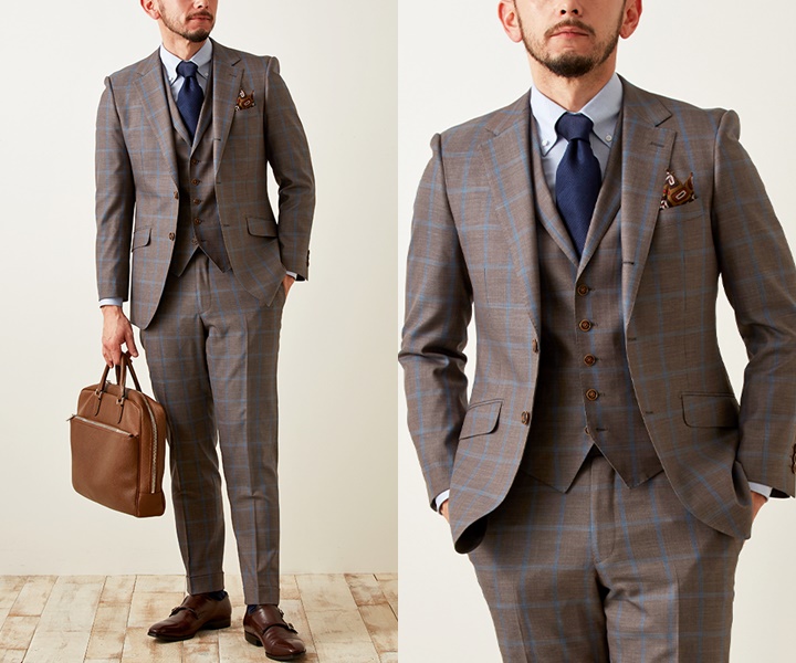 明るいトーンのブラウンにブルーのウィンドウペン柄を組み合わせたスタイル。スーツとカバンを同系色でまとめることで、コーデに統一感が出ておしゃれ度が増します。