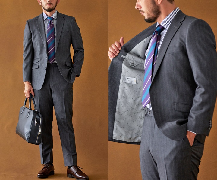 落ち着いた色味のグレー×シャドーストライプのスタイル。グレーのスーツにネイビーのカバンを合わせることで、モードな空気感を醸し出すことができます。