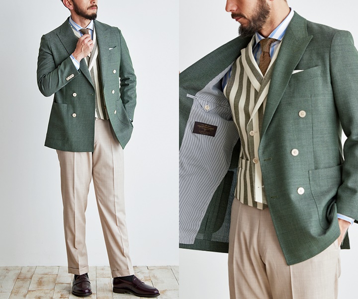 グリーンスーツ×グリーンストライプ柄ベストは、カジュアルシーンで活躍します。スーツは、織りが美しいグリーンの無地で、春夏シーズンに最適です。薄い印象になりがちなアースカラーのジャケパンスタイルに、特徴的な襟付きのラペルドベストを合わせたメリハリのあるコーデです。堅苦しさがなく、気軽な雰囲気を楽しめます。