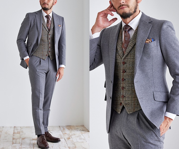 グレースーツ×グレーチェック柄ベストは、ビジネスシーンで活躍します。スーツは、温かみのあるグレーカラーのフランネル生地にシンプルな無地スタイルです。ベストには、ジャケットの厚みに負けないツイード素材のチェック柄を合わせ、秋冬に最適なオッドベストコーデです。清潔感のある大人っぽい雰囲気を演出できます。