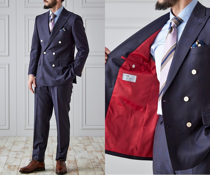 ネイビーに近い色味のパープルカラーに特徴的なチェック柄を取り入れたダブルスーツです。裏地にはパープルと相性の良いワインレッドを採用し、高級感漂う貝ボタンがさらに上質さを感じさせます。ネクタイ・シャツ・チーフはブルーやパープルでまとめることで、統一感がありながらも華麗さが際立つスタイルに仕上がっています。