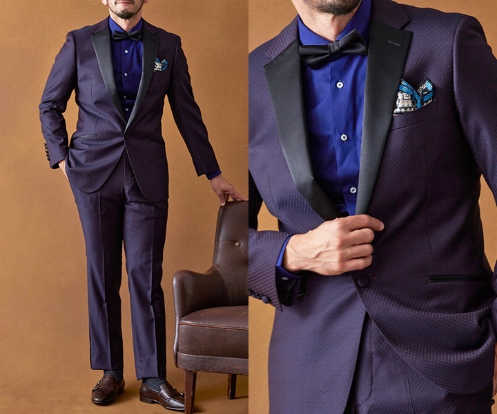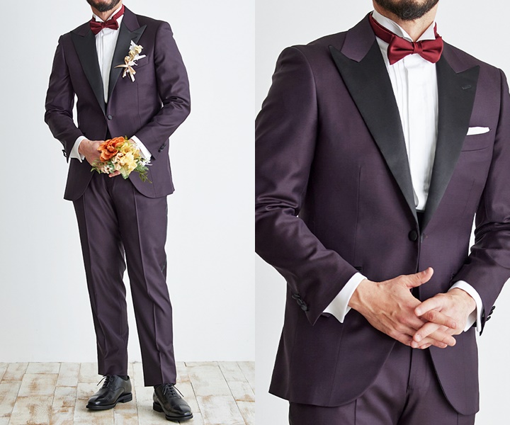 艶やかで色気の漂うパープルカラーが魅力的なタキシードです。ブラックの拝絹がパープルを引き立て、ピークドラペルがシャープな印象を与えます。ヒダ胸のウィングカラーシャツに赤の蝶ネクタイを取り入れることでエレガントなスタイルを完成させます。結婚式やパーティーなど特別な日に注目を集めること間違いなしの一着です。