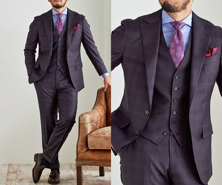 深みのあるネイビー系の紫色に程よい大きさのチェック柄が特徴のスリーピーススーツです。スーツに合わせた紫色のネクタイと赤色のチーフが絶妙なアクセントとなり、落ち着きの中にさりげない美しさをプラス。自分の色をしっかりと表現できる洗練された印象を与えます。ビジネスからカジュアルまで幅広く活用できる一着です。