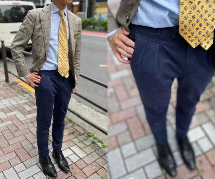 ツータックパンツは体型に合っていない大きすぎるサイズを選ぶとだらしなく見えたり、野暮ったく見えることがあります。特に細身の方はボリューム感が強調されやすい傾向があります。ツータックは大柄な方に向いていますが、細身の方でも適切なサイズ感のものを選び、ジャストサイズのジャケットと組み合わせることで、スタイリッシュに見せることが可能です。ゆとりがあるパンツが好きな人も、ゆとりを求めすぎないよう、オーダースーツなど自分の体型に合ったパンツの着用を検討するのも良いでしょう。