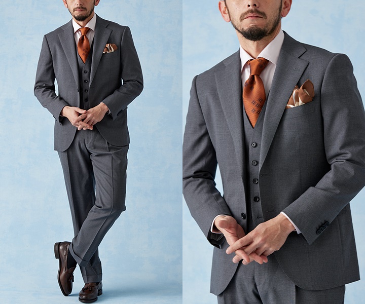 大人っぽく知的な雰囲気のあるグレースーツスタイル。上品なグレージャケットのフロントボタンは2つ仕様で、クラシックながらも現代的なバランスを保ったデザインです。オレンジのネクタイがアクセントとなり、落ち着いた色合いのスーツに華やかさがプラスされたコーデとなります。