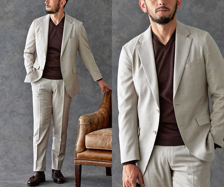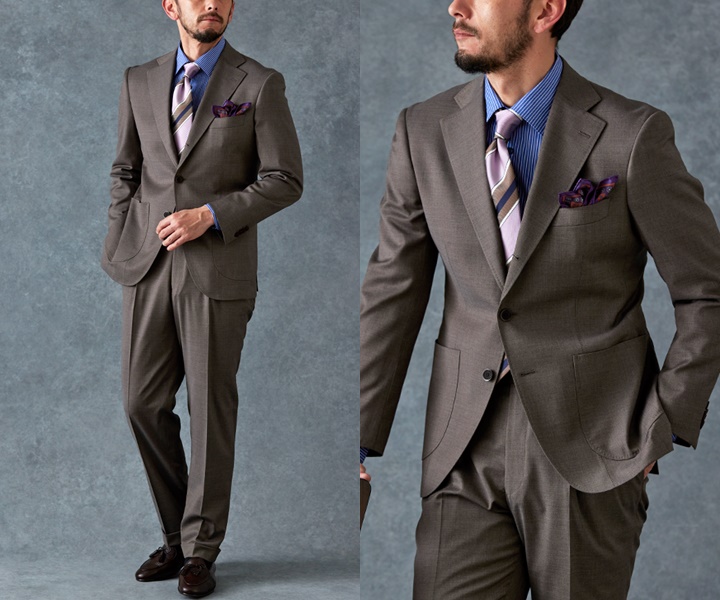 暖かさと落ち着いた雰囲気のあるブラウンスーツスタイル。明るすぎない落ち着いたブラウン無地のスタイルで、袖口のボタンは4つ並べて配置し、クラシックな印象に仕上げています。控えめなデザインながら、さりげないこだわりを感じさせるコーデとなります。