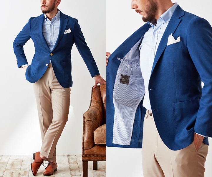 軽やかな織りで発色の良いブルー×ベージュのジャケパンスタイル。清涼感のあるブルーのジャケットにベージュのパンツを合わせることで、春夏らしい爽やかなスタイルになります。カジュアルと相性の良いボタンダウンのシャツを使うことで、ビジネスや休日にも使えるきれいめカジュアルコーデになります。
