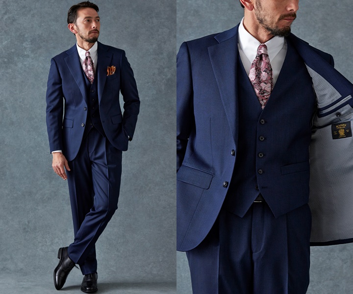シンプルで幅広い場面で使用できるネイビースーツスタイル。ダークネイビーの生地にピンヘッドに似た組織柄がさり気なく入ったスーツは、フォーマルな場面でも重宝します。また、裏地にシルバーのダイヤ柄を採用することで、上品な印象を与えるコーデが完成します。