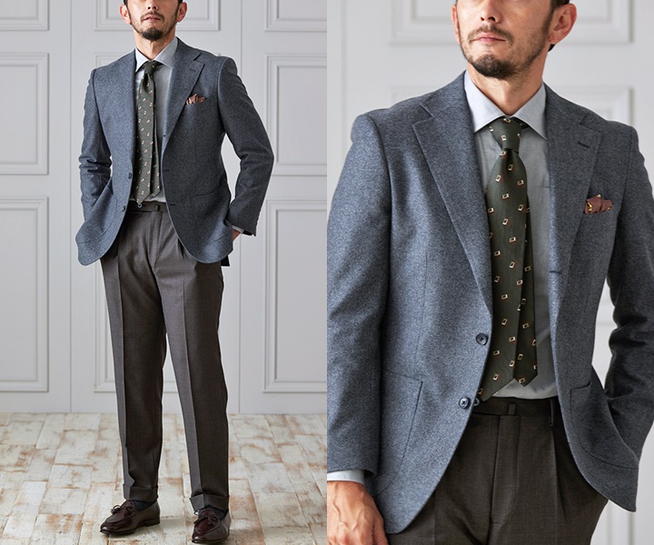 落ち着いた色合いのグレー×ブラウンのジャケパンスタイル。グレーのジャケットにブラウンのパンツを合わせることで、カジュアルすぎずフォーマル過ぎないバランスを実現できます。ネクタイとチーフに寒色と暖色をバランスよく取り入れた、高級感のある着こなしです。